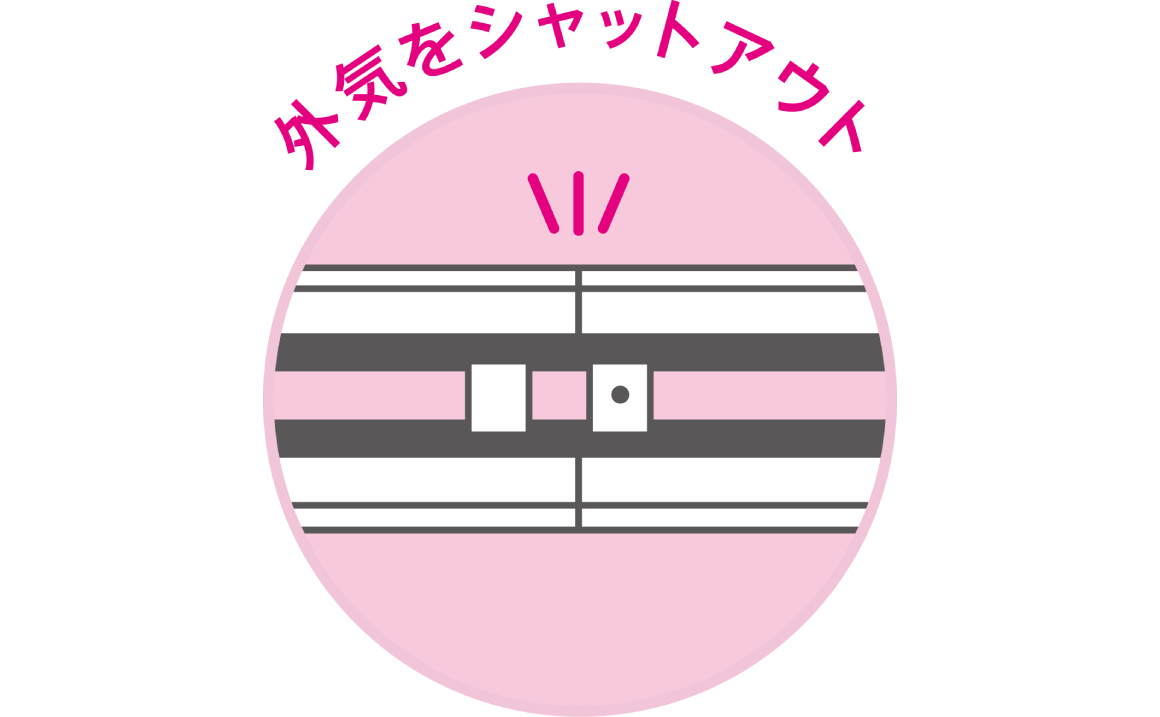 本体の気密材が優れた気密性を発揮します。また気密材には逃げ込み代を設けており、気密材の劣化を防ぐ安心設計。なお、ジョイント部、切断部分やコーナー部には付属の気密テープで気密性を確保します。