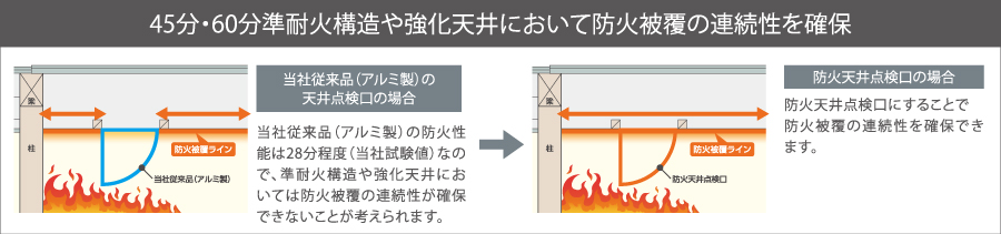 当社従来品(アルミ製)の防火性能は28分程度(当社試験値)なので、準耐火構造や強化天井においては防火被覆の連続性が確保できないことが考えられます。防火天井点検口にすることで防火被覆の連続性を確保できます。